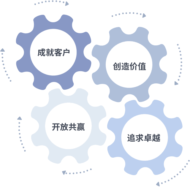 成就客户是一切决策的出发点,,,创造价值是衡量所有工作的标准,,追求卓越是我们做事做人的态度,,,开放共赢是我们的格局也是最终的结果。。。。价值观的齿轮环环相扣,,,推动着组织里的每个人不断向前。。。。
